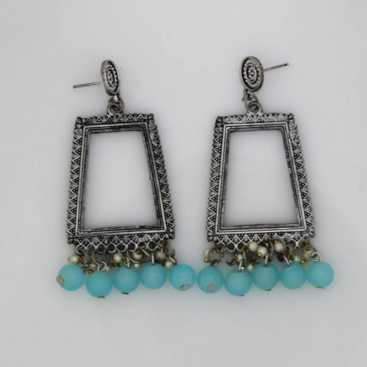 Artificial Silver Rectangle Jhumka Bezel With Sky Blue Pearls - 1.3x1.8 Inch Pair for Resin Jewellery Making | JustKraft