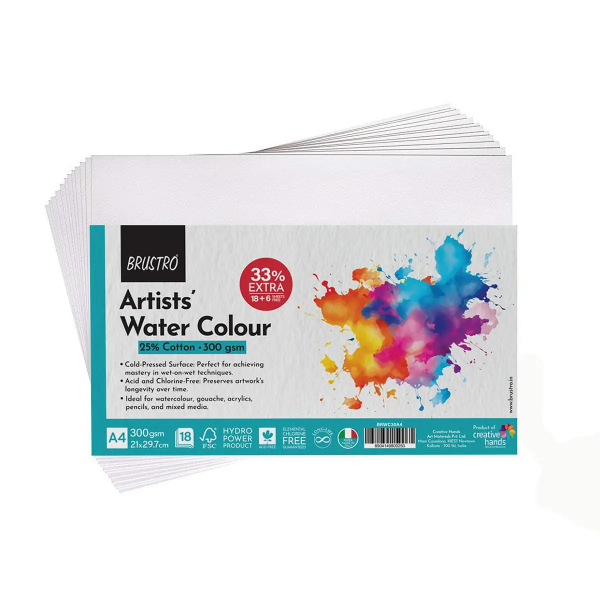 The Brustro Artistsβ Watercolour Paper Pad A4 (300 GSM) is designed for artists who require a professional surface for watercolor painting and wet media techniques. Made with 25% cotton content, the paper offers excellent water absorption and smooth pigment flow, allowing artists to achieve vibrant washes, gradients, and expressive watercolor effects.