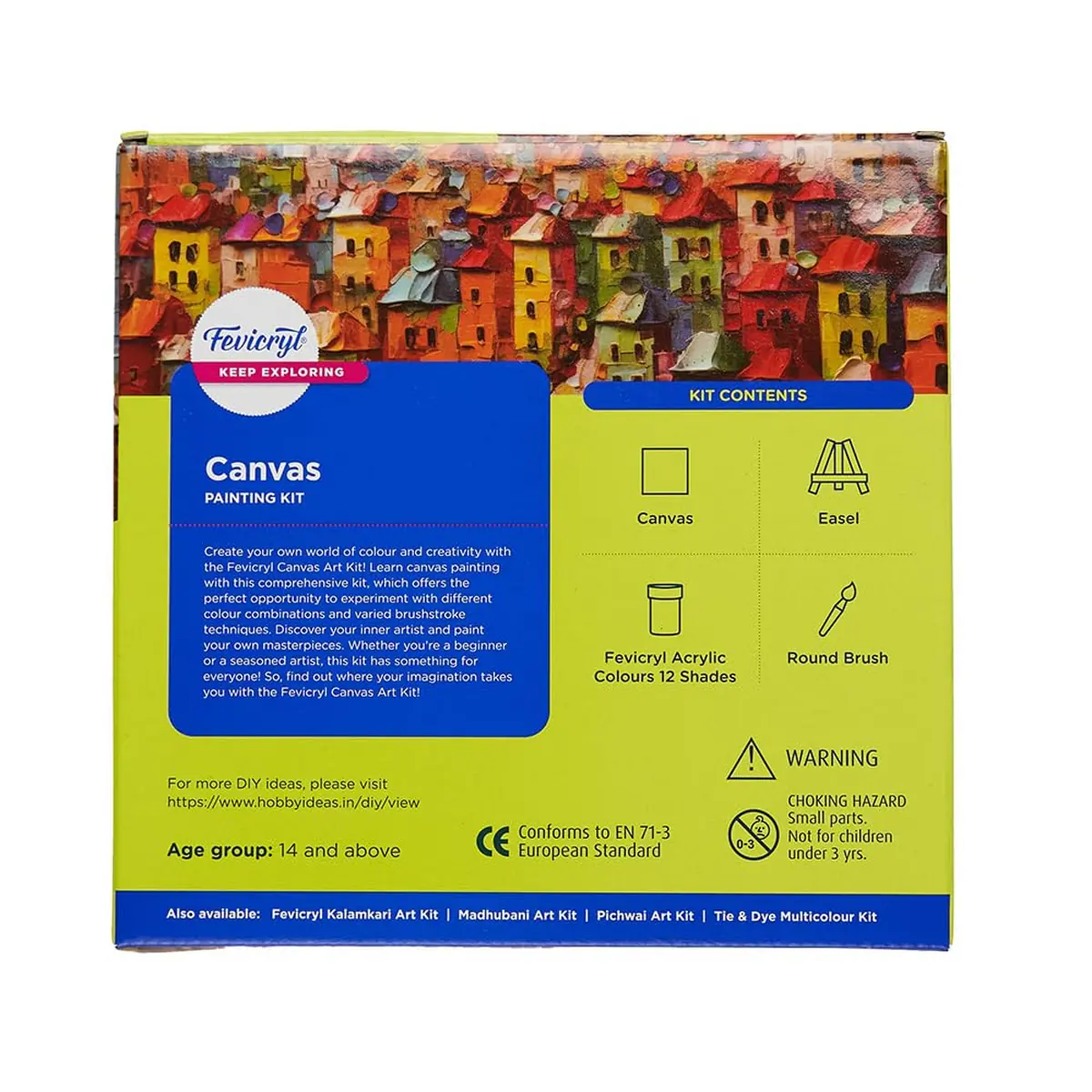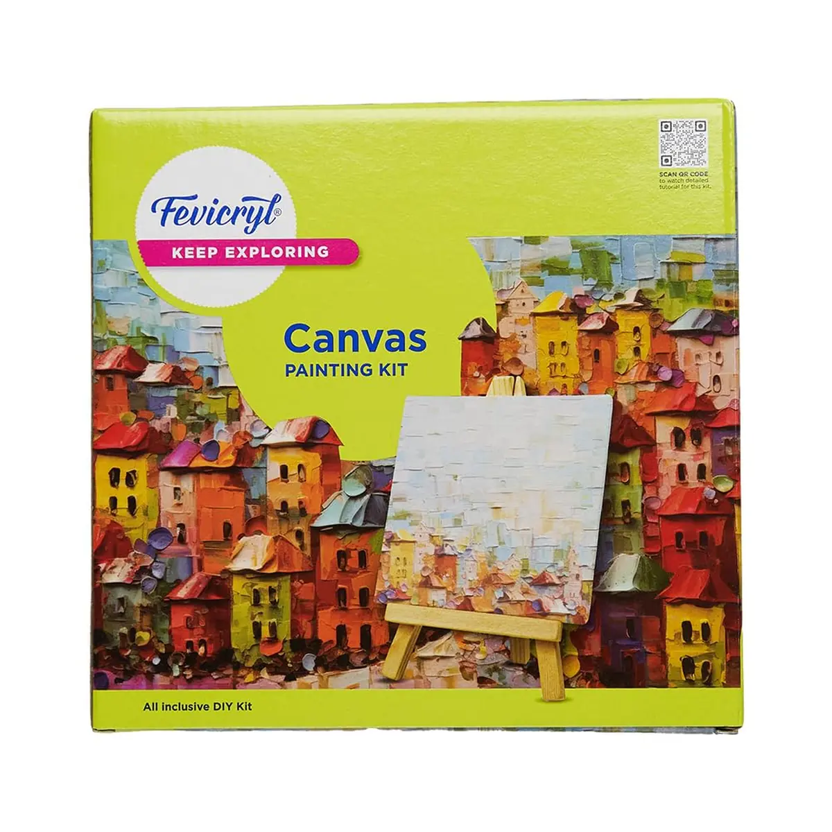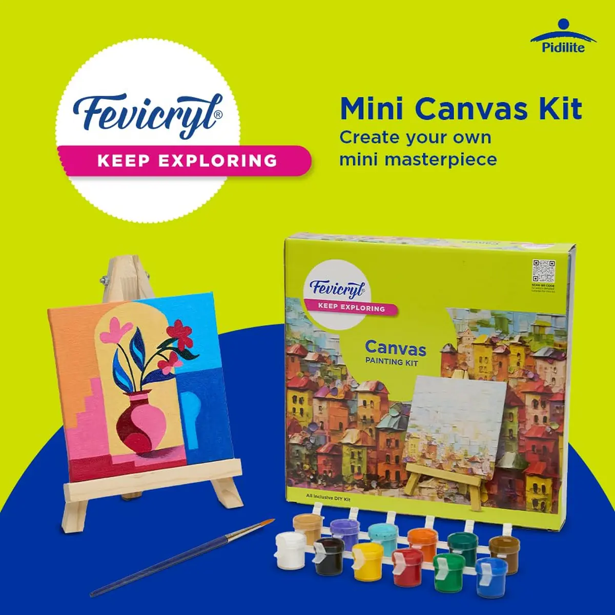 The Fevicryl Canvas Painting Kit is a complete DIY painting set designed for beginners and hobby artists who want to explore canvas art. This all-in-one kit includes a primed canvas, mini easel, vibrant Fevicryl acrylic colours and a brush, allowing you to start painting immediately and create your own decorative artwork.