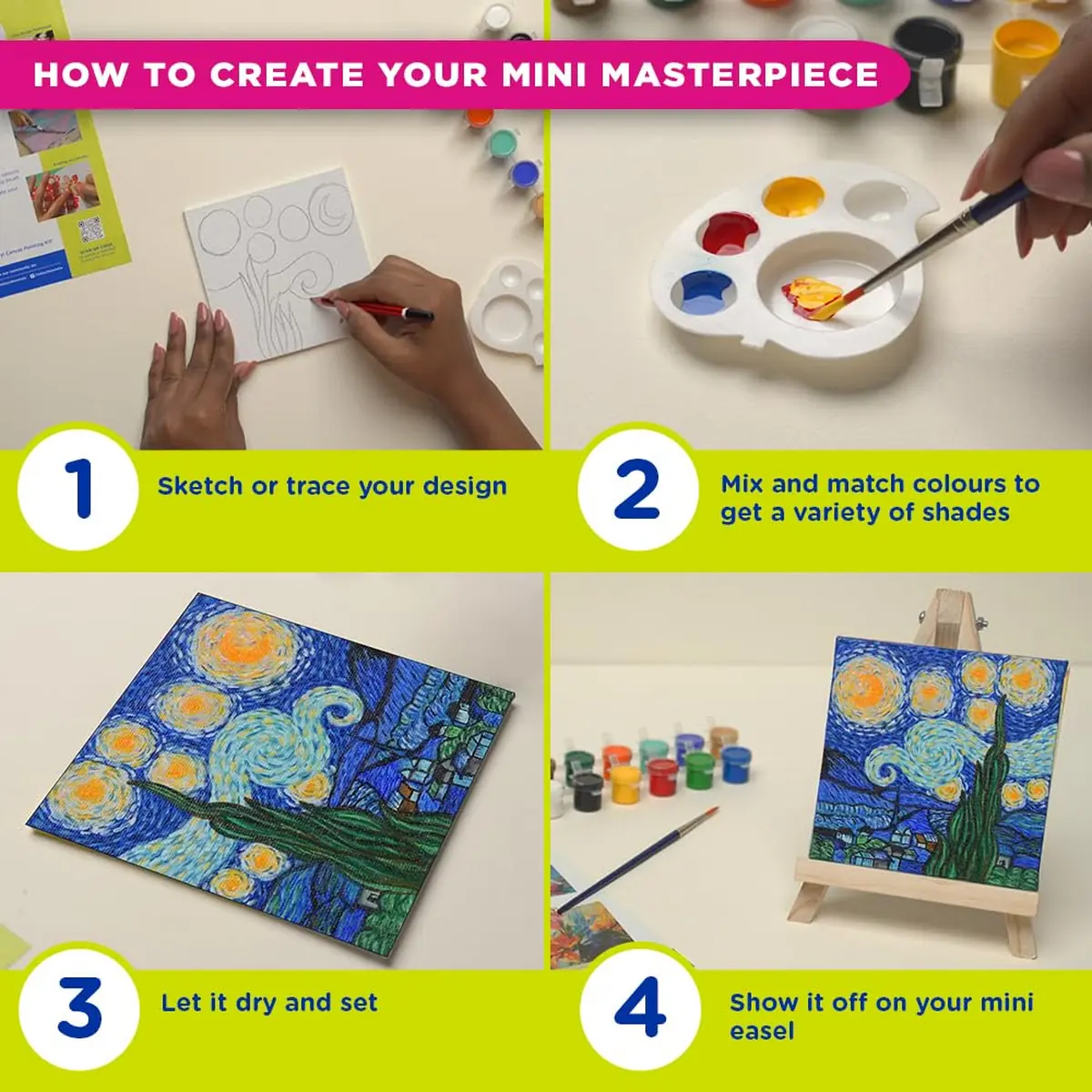 The kit includes a canvas board, mini easel, acrylic colours and a painting brush.