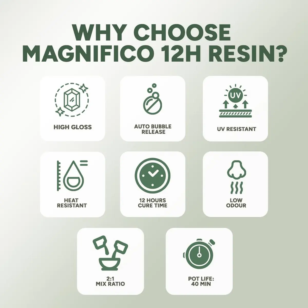 Magnifico 12H epoxy resin kit designed for resin art, wood coating, furniture finishes, and protective layers. This kit includes 1kg resin and 500g hardener with a precise 2:1 mixing ratio for reliable curing and strength. The resin cures crystal clear with a high gloss finish and offers good UV resistance to reduce yellowing over time. Suitable for artists, DIY creators, and professional applications requiring a smooth, durable surface.