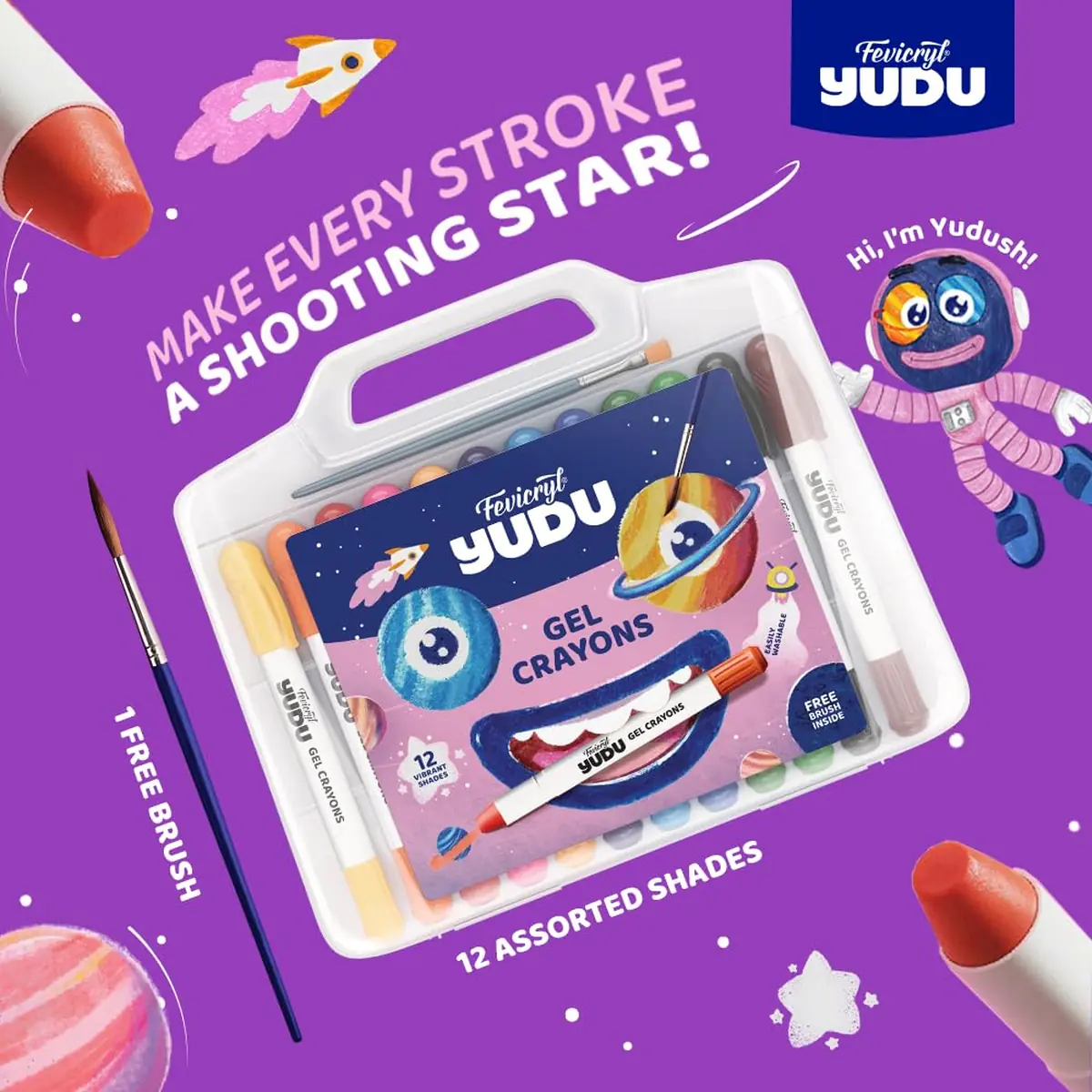 YUDU Gel Crayons 12 Colours - Twistable Washable Crayons with Brush for Kids